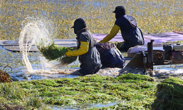 부산 기장군 철마면의 한 미나리꽝에서 13일 오전 농민들이 아삭한 식감과 향긋한 향으로 인기가 높은 미나리를 수확하고 있다. 미나리는 해독 작용을 하고 혈액 정화 효과가 있는 것으로 알려져 봄철 먹거리로 사랑받고 있다. 정종회 기자 jjh@