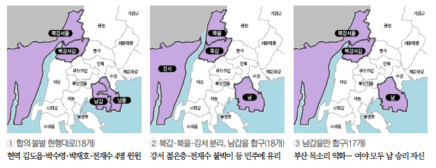 이와 관련, 캐스팅보트 역할을 해온 부산의 선거구 변동에도 이목이 쏠린다. 현재까지 여야의 논의에 따르면 선거구 획정위가 제시한 안인 남갑·을을 한 개로, 북강서갑·을은 북갑과 을, 강서로 분리하는 방안에 무게가 실리고 있다.