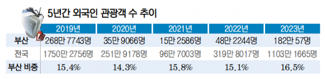 코로나19 이전에 비해 관광객 수는 아직 회복이 더디나, 부산이 차지하는 점유율은 더 늘어났다. 지난해 한국을 찾은 외국인 관광객은 1103만 1665명으로, 부산의 점유율은 16.5%에 달한다. 2019년(15.4%)과 비교해도 1.1%포인트 늘어난 수치다.
