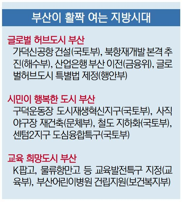 윤 대통령은 이날 지역이 주도하는 교육발전특구 지정, 자율형 국립 고교, K팝 고교, 항만물류고 등 특성화 고교 설립 등을 거론했다. 부산 어린이병원 건립도 부산시민의 행복을 위한 중요한 조건 중 하나로 내놓았다. 저출산과 지역의 의료 소외라는 문제를 풀기 위해서는 반드시 필요하다는 것이어서 올해 중앙 정부가 국비 예산 편성 때 얼마나 배려가 될지도 관건이다. 낙후된 사직구장과 구덕운동장 재개발도 중앙 정부의 국비 지원을 통해 이뤄질 것으로 보인다.