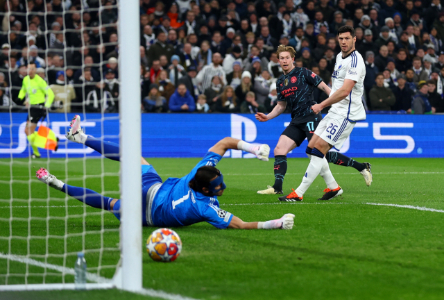 맨체스터시티의 케빈 더브라위너(가운데)가 14일(한국시간) 덴마크 코펜하겐의 파르켄 스타디움에서 열린 유럽축구연맹(UEFA) 챔피언스리그(UCL) 16강 1차전 코펜하겐과의 경기에서 선제골을 뽑아내고 있다. 2년 연속 트레블(3관왕)에 도전하는 맨시티는 이날 3-1로 완승을 거둬 대회 8강 진출에 한 발짝 더 다가섰다. 맨시티와 코펜하겐의 16강 2차전은 내달 7일 열린다. 로이터연합뉴스
