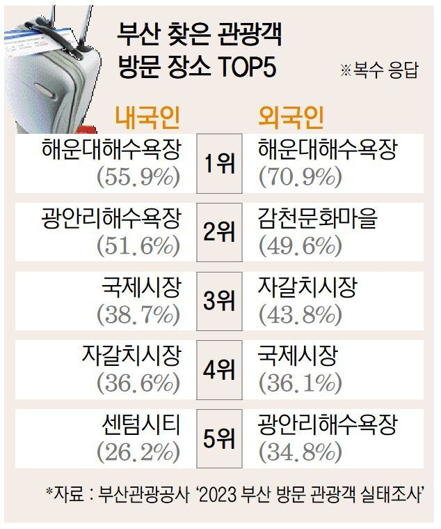 14일 부산관광공사가 발표한 ‘2023 부산 방문 관광객 실태조사’에 따르면, 응답자들이 방문한 장소는 해운대 해수욕장(63.4%), 광안리 해수욕장(43.2%), 자갈치시장(40.2%), 국제시장(37.4), 감천문화마을 (33.7%) 순으로 나타났다. 이 조사는 지난해 7월~12월 부산 방문 관광객 총 2000명(내국인 1000명·외국인 1000명)을 대상으로 진행됐다.