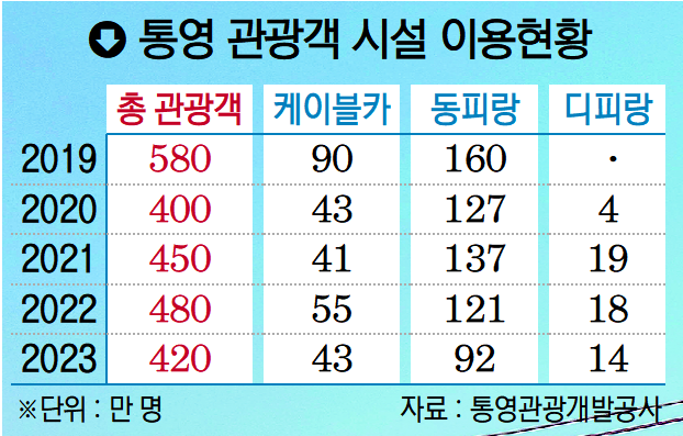 2019년 시작된 코로나19 팬데믹에 믿었던 케이블카마저 무너졌다. 그해 누적 탑승객 90만여 명에서 이듬해 43만여 명으로 반 토막 났다. 2021년 42만 명으로 바닥을 찍은 뒤 1년 뒤 56만여 명으로 반등했지만, 지난해 다시 43만여 명으로 주저앉았다. ‘포스트 케이블카’로 선보인 어드벤처타워, 모노레일, 디피랑 등 대체 시설도 기대만큼의 반향을 끌어내진 못했다. ‘삼도수군통제영 실감 콘텐츠 체험존(통영 VR존)’은 이용자가 없어 적자만 쌓이자 아예 문을 닫았다.