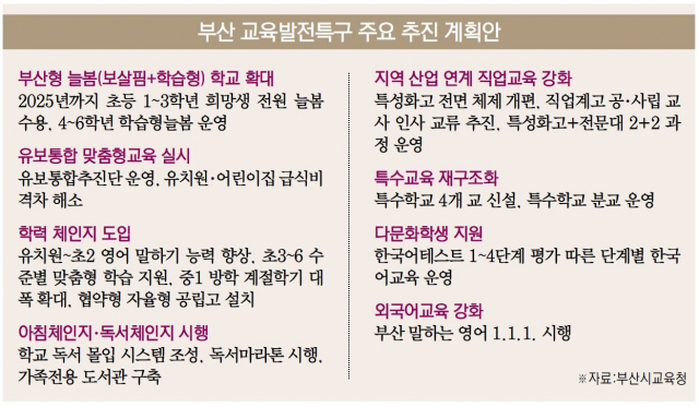 부산시교육청과 부산시가 14일 발표한 교육발전특구 세부 추진 계획에는 유아·어린이의 늘봄교육부터 고등학생의 학력 신장까지 부산 공교육 강화를 위한 구체적인 실행 계획이 포함됐다. 학생들이 사교육 시장에 노출되는 것을 막고, 학교 기능을 되살리겠다는 의지로 풀이된다. 두 기관은 이달 발표 예정인 교육발전특구 시범지역 지정을 계기로 ‘부산형 교육 체계 구축’에 속도를 낼 계획이다.