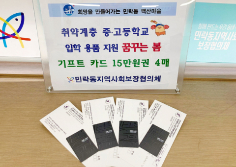 부산광역시 수영구 민락동 행정복지센터(동장 임영아는) 민락동 지역사회보장협의체(위원장 유병일) 주관으로 2024년 중 ·고등학교에 입학하는 저소득 취약계층 자녀들에게 입학 용품을 지원하는 『꿈꾸는 봄』 사업을 추진한다고 밝혔다.