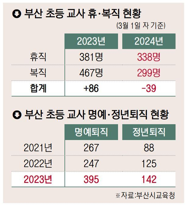 이는 지난해 상황과 정반대다. 지난해엔 휴직에서 돌아온 복직 교사(467명)가 휴직 교사(381명)보다 86명 더 많았다. 결국 지난해와 비교해 2024년 부산 초등학교에서 근무할 교원 수는 125명 줄어든 셈이다. 이는 시교육청이 올해 임용 선발한 신입 교원 313명 중 입대 교원 5명을 제외한 308명을 전원 발령하고도 나온 수치여서 상황의 심각함은 더욱 크다.