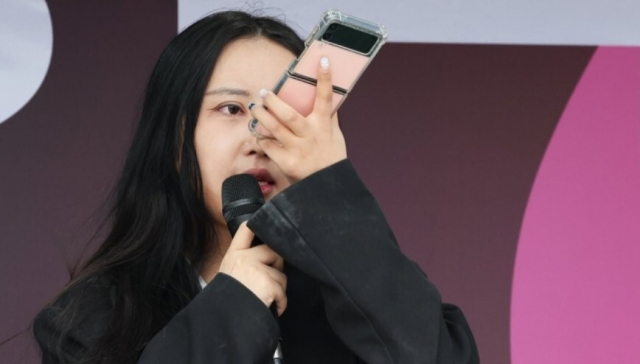 '국정농단' 사건으로 수감 중인 최서원(개명 전 최순실) 씨의 딸 정유라 씨가 지난 2022년 경기도 수원시 지동교에서 열린 무소속 강용석 경기도지사 후보 출정식에서 지지 발언을 하며 눈물을 닦고 있다. 연합뉴스