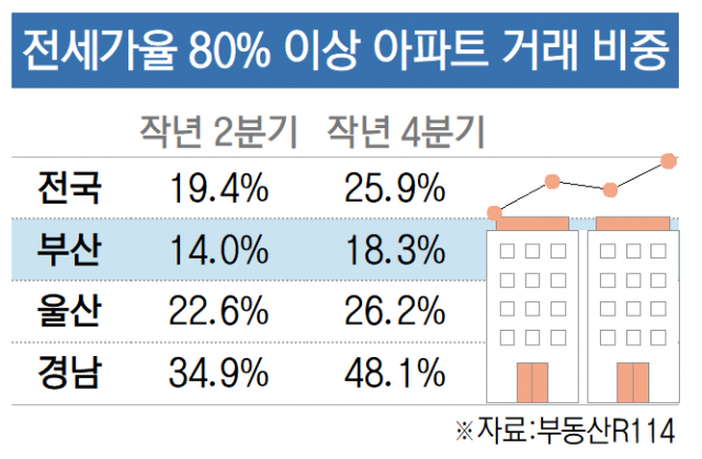 4분기 전세가율이 80% 이상인 전세계약 비중을 지역별로 보면 전북 57.3%, 충북 55.3%, 경북 54.2%, 경남 48.1% 등으로 주로 지방이 높았다. 부산은 전세가율 80% 이상인 아파트 전세계약이 18.3%였고 울산은 26.2%였다. 서울(5.1%) 세종(7.5%)은 상대적으로 매우 낮았다.