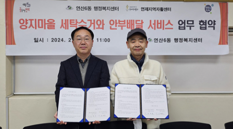 연제구 연산6동(동장 임용수)은 지난 14일 행정복지센터에서 ‘양지마을 세탁수거와 안부배달 서비스’의 원활한 운영을 위해 연제지역자활센터(센터장 정덕용)과 업무협약을 체결하였다.