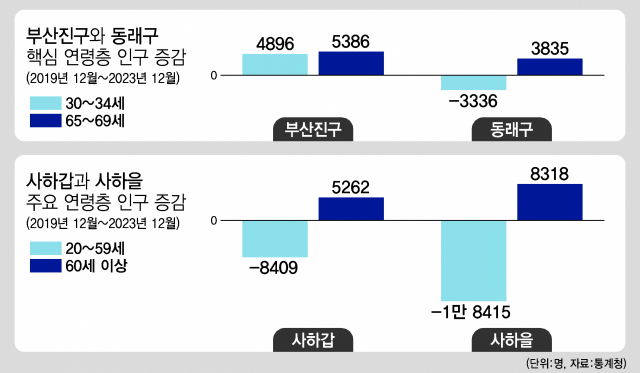 갑·을 지역구 경계 조정 가능성이 제기되는 사하구는 지난 4년간 2만 3173명의 인구가 줄었다. 4년간 이 지역 아파트 입주도 4138세대로 비교적 적었다. 인구 유출과 함께 고령화도 심화됐다. 20~50세 인구가 2만 6824명 줄어드는 동안 60세 이상 인구는 1만 3580명 늘었다. 인구 고령화는 사하갑보다 사하을에서 더 분명하게 나타났다. 사하갑은 4년간 20~50세 인구 8409명이 줄었는데 사하을에선 1만 8415명이 줄었다. 60세 이상 인구는 사하갑에서 5262명 늘었고 사하을에서 8318명 늘었다.