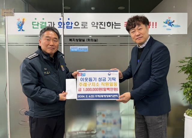 부산구치소(소장 박수연)는 최근 사상구 주례3동(동장 김병국)에 취약계층을 돕기 위해 직원들이 십시일반 모은 성금 100만 원을 전달했다.