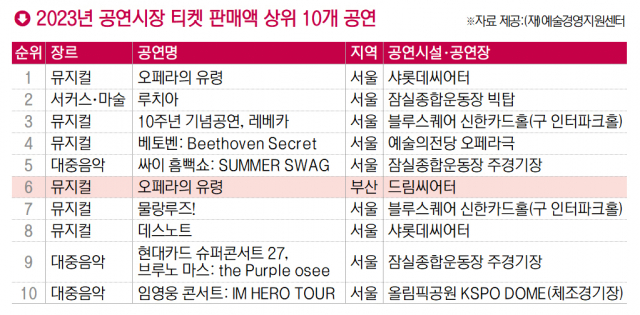 예매 상위권 작품 목록에서도 뮤지컬과 대중음악의 강세를 확인할 수 있다. 지난해 예매 및 티켓 판매액 순위 상위 20개 작품에는 뮤지컬 13건, 대중음악 6건이 이름을 올렸다. 다른 장르 작품은 태양의서커스 내한공연 ‘루치아’ 서울 공연이 유일했다. 뮤지컬은 ‘오페라의 유령’을 비롯해, ‘레베카’ ‘베토벤’ ‘물랑루즈!’ 등이 이름을 올렸다. 대중음악 공연으로는 ‘싸이 흠뻑쇼’ , ‘현대카드 슈퍼콘서트 브루노 마스’ ‘임영웅 콘서트:아임 히어로 투어’ 등이 있다. 서울 이외 지역에선 ‘오페라의 유령’ 부산(6위) 공연과 ‘싸이 흠뻑쇼’ 부산(18위)·수원(20위) 공연이 포함됐을 뿐이다.