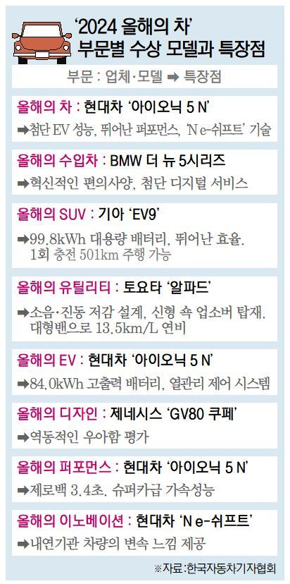 현대자동차 N 브랜드 최초의 고성능 전기차 ‘아이오닉 5 N’이 한국자동차기자협회가 매년 국내 출시 차량에 대해 선정하는 ‘2024 올해의 차’에서 대상을 비롯해 EV(전기차)·퍼포먼스·이노베이션까지 4관왕에 올랐다. 올해의 수입차에는 BMW 중형 세단 더 뉴 5시리즈, 올해의 SUV(스포츠유틸리티차량)는 기아 플래그십(기함) 전기차 ‘EV9’, 올해의 유틸리티는 토요타의 프리미엄 미니밴 ‘알파드’가 각각 차지했고, 올해의 디자인은 제네시스 대형 SUV ‘GV80 쿠페’가 선정됐다.