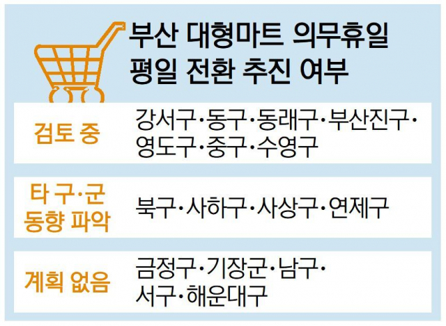 지난달 정부도 평일 전환 추진 의사를 밝혔지만, 나머지 구·군은 신중히 접근하는 모양새다. 북구·사상구·사하구·연제구 등은 부산 다른 구·군 추진 동향을 지켜보고 있다고 했다. 기장군·남구·금정구·서구·해운대구 등은 평일 전환을 검토하지 않았다는 입장을 밝혔다. 이런 차이는 지역마다 대형마트, 전통시장 현황과 파급력이 다른 점이 영향을 미친 것으로 보인다.