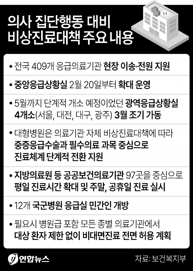 의료대란이 가시화하면서 비상진료체계도 전면 가동된다. 정부는 중증 응급환자가 치료를 받을 수 있도록 국군수도병원과 국군대전병원 등 전국 12개 국군병원 응급실을 민간에 개방했다. 부산의료원을 비롯해 지방의료원과 적십자병원 등 공공병원 97곳은 민간병원에서 환자를 받아 응급수술을 진행할 수 있는 체제를 갖춘다. 평일 진료 시간을 오후 8시까지로 늘리고, 주말과 공휴일에도 진료하기로 했다.