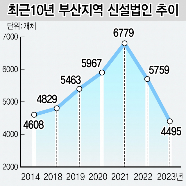 지난해 부산 지역 신설법인 수가 10년 전 수준에도 미치지 못한 것으로 나타났다. 고금리·고물가에 내수 부진까지 겹치면서 부산 경제가 좀처럼 회복하지 못하고 있다는 방증이다.
