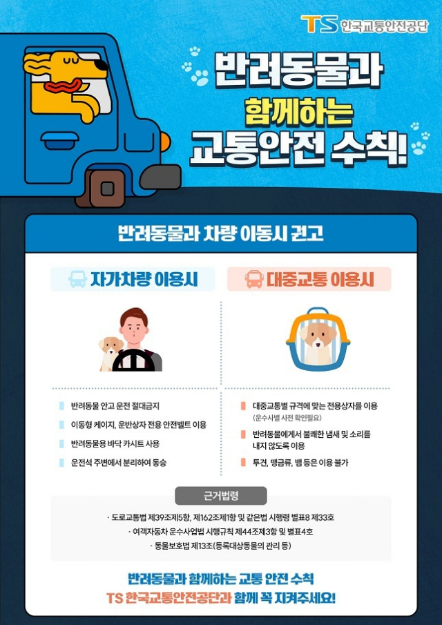 한국교통안전공단은 반려동물과 동반해 운전할 때는 이동형케이지, 운반상자 전용 안전벨트 등을 이용해야 안전운전에 효과적이라고 밝혔다. 또 반려동물용 바닥 카시트를 사용하고, 반려동물을 운전석 주변에서 분리해 동승해야 한다. 아울러 대중교통을 이용할 때는 반드시 규격에 맞는 전용운반상자를 활용해야 한다.