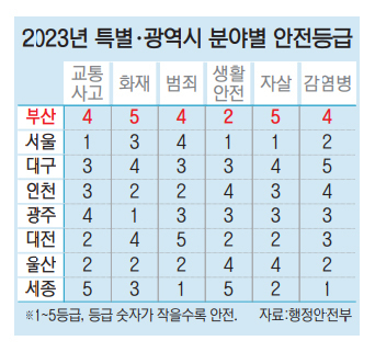 행정안전부가 최근 발표한 ‘2023년 전국 지역안전지수’에 따르면 부산은 전국 8개 특별·광역시 중 최하위 등급을 가장 많이 받는 등 전반적으로 지표가 좋지 못했다. 화재와 자살 분야에서는 최하위인 5등급을 기록했고, 교통사고·범죄·감염병은 4등급으로 진단됐다. 그나마 생활안전 분야가 2등급을 받았고, 1등급을 기록한 분야는 없었다.