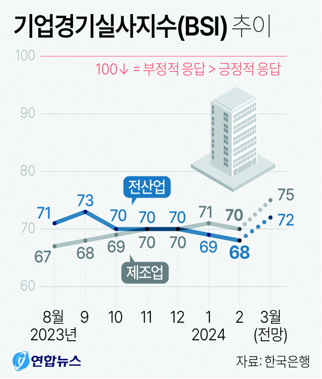 한국은행이 21일 발표한 2월 기업경기실사지수(BSI) 및 경제심리지수(ESI) 조사 결과에 따르면 이달 전산업 업황 BSI는 전월보다 1포인트(P) 하락한 68을 기록했다. 이는 2020년 9월(64) 이후 최저치다.
