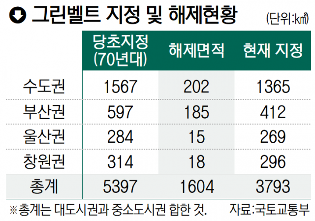 울산 그린벨트는 울산시 전체 25%에 달하는 데다 전국 대도시 중 유일하게 도심 한가운데 그린벨트가 자리 잡고 있다. 또 그린벨트의 79%가 1~2등급에 묶여 있다. 이에 울산시는 다운동 그린벨트 19만㎡를 해제해 2029년까지 도심융합특구 조성사업을 추진하는 등 적극적인 그린벨트 해제로 도시지역 확장을 추진한다는 방침이다.