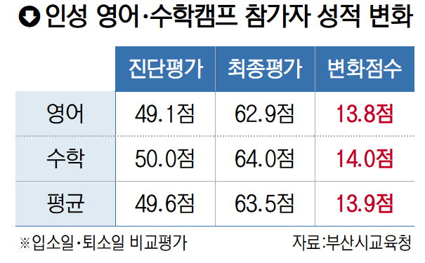부산시교육청이 중1 학생을 대상으로 겨울방학 동안 처음 진행한 ‘인성 영어·수학 캠프’(영수캠프)와 ‘위캔두 계절학교’(계절학교)가 학생 교과 성적 향상에 도움이 된 것으로 나타났다. 영수캠프와 계절학교는 참여 학생은 물론 강사와 학부모에게 좋은 평가를 받았다.