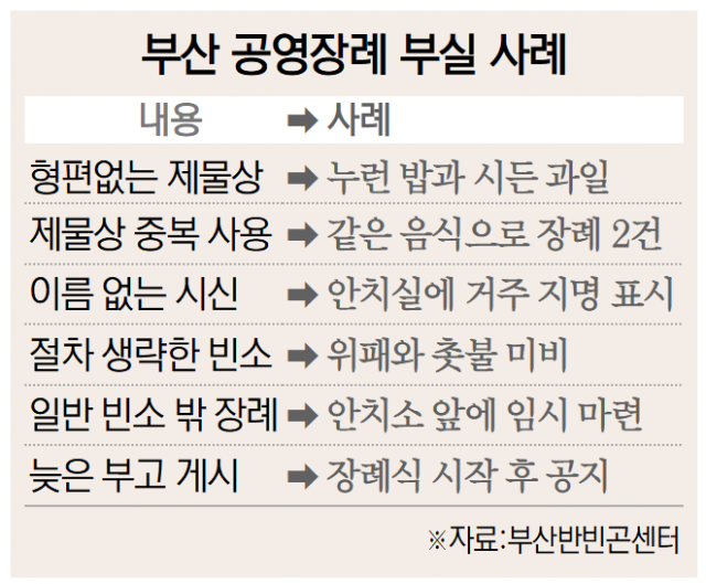 점검 결과, 부실하게 차려진 제물상은 흔했다. 일부 장례업체가 비용을 줄이려고 제단에 음식을 간단하게 올렸고, 오래된 음식 재활용도 다반사였던 것으로 추정된다. 부산시와 구·군에 따르면 보통 공영장례는 장례업체에 위탁하며, 1건당 80만 원 미만이 지급된다.
