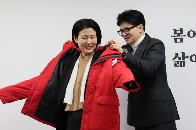 국민의힘 한동훈 비상대책위원장이 22일 중앙당사에서 열린 인재영입식에서 양종아 한뼘클래식기획 대표에게 당 점퍼를 입혀주고 있다(위쪽). 더불어민주당 이재명 대표와 의원들이 이날 국회 본회의장에서 대정부질문 시작 전 기념촬영을 하고 있다. 연합뉴스