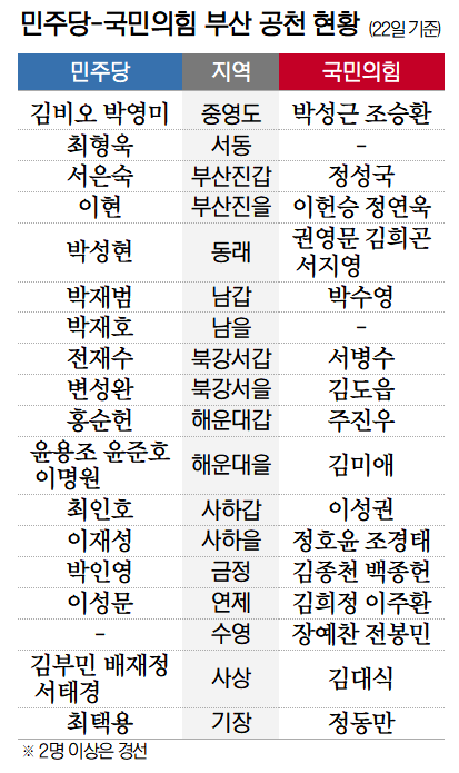 더불어민주당도 내달 초 부산 지역구 경선이 사실상 마무리되면서 조만간 여야 최종 대진표가 확정될 예정이다.