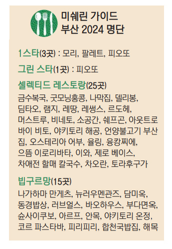 이번에 1스타 레스토랑으로 선정된 세 곳의 레스토랑 모두 오픈한 지 5년이 채 되지 않은 곳들이다. 해운대구에 위치한 일식당 모리는 2021년 문을 열었다. 일본에서 요리를 배운 김완규 셰프가 일본인 아내와 함께 운영하며, 정통 일본 코스요리를 선보인다. 부산에서 난 해산물과 제철 농산물을 이용해 새로운 메뉴를 구성해나가고 있다. 김완규 셰프는 “앞으로도 지금까지 해온 것처럼 아침에 시장 가서 신선한 식자재를 구입해 맛있는 요리로 보답하겠다”고 말했다.