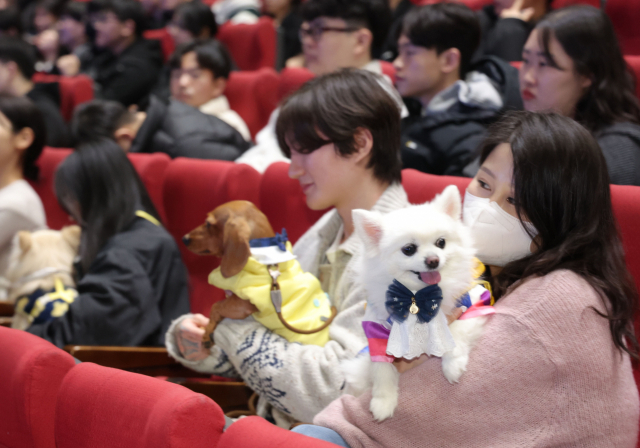 부산 수영구 KBS홀에서 22일 열린 2024학년도 동명대학교 신입생 입학식에서 새내기 반려견들의 입학식이 진행됐다. 동명대는 지난해 3월 전국에서 처음으로 ‘반려동물 단과대학’을 설립해 운영 중이며 이날 행사는 신입생들의 입학을 축하하기 위한 이벤트로 마련됐다.