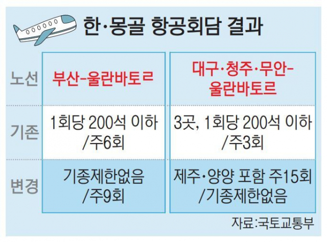 먼저 부산-울란바토르 노선은 운항기종 제한없이 기존 주 6회에서 주 9회로 늘어난다. 지금은 1회당 200석 이하로 주 6회 운항을 할 수 있었다.