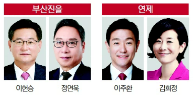 부산진을에서는 현역인 3선 이헌승 의원과 정연욱 전 동아일보 논설위원이 맞붙는다. 이 의원의 경우 ‘동일 지역 3선 이상’에게 주어지는 15%의 감산 핸디캡을 안고 있지만, 의정 활동 하위 30% 감점과는 무관한 것으로 알려졌다. 대신 정 전 논설위원이 양자 경선 ‘신인(양자 경선)’의 7% 가산을 받게 된다. 수영과 금정에서는 현역 전봉민 의원과 백종헌 의원이 모두 탈당 이력이 있어 나란히 5점의 감산 핸디캡을 안았다. 그러나 장예찬 전 최고위원이 부산에서 가장 많은 가점인 ‘정치 신인(양자 경선)’ 15%의 가산을 받는 상태여서 부담이 동일하지는 않다. 연제에선 현역 이주환 의원과 김희정 전 의원의 3번째 경선 대결에서는 김 전 의원이 ‘비신인 여성(양자 경선)’ 5%를 안고 경선에 나서게 됐다.