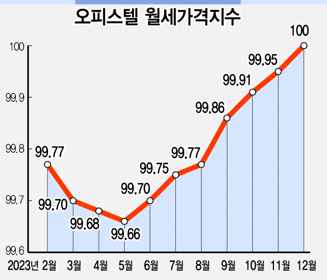 25일 한국부동산원에 따르면 올해 1월 전국 오피스텔 월세가격지수는 100.07을 기록했다. 지난해 5월 99.66을 기록하며 저점을 찍은 뒤, 8개월째 상승세를 이어가고 있다. 수도권에서는 월세 거래량도 크게 늘어났다. 지난해 서울 지역 오피스텔 전월세 거래 총 6만 6720건 가운데 월세 거래 비중은 61.4%(4만 938건)에 달했다. 2021년 51.5%, 2022년 55.8%를 각각 기록했던 것과 비교하면 2년 만에 약 10%포인트 높아졌다.