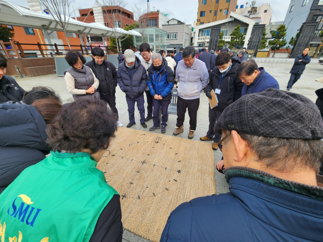 경남 통영시 한산대첩광장에서 지난 23일 열린 '제37회 시장기타기 통영전통연날리기 및 민속놀이 경연대회'에 참여한 시민들이 윷판 주위에 모여 윷놀이를 즐기고 있다. 통영시 제공