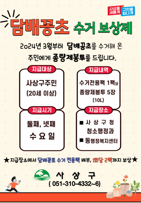 조병길 사상구청장은“담배꽁초 수거보상제를 통해 거리에 무분별하게 버려져 도시 청결을 저해하는 담배꽁초 문제를 주민 스스로 해결하고 환경 오염까지 방지하는 일석이조의 효과를 기대한다”며“앞으로 탄소중립 실천과 생활폐기물 감축을 위해 보다 더 노력하겠다”고 말했다.