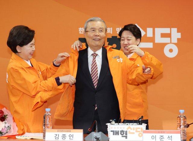 개혁신당 이준석 대표가 26일 국회에서 열린 최고위원회의에서 김종인 공천관리위원장에게 당의 컬러인 오렌지색 점퍼를 입혀주고 있다. 연합뉴스
