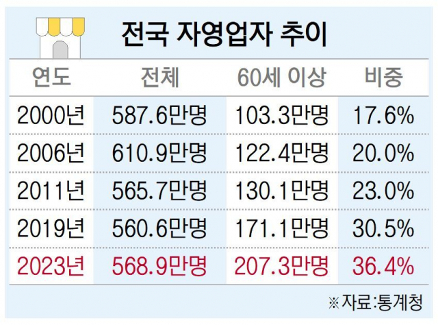 지난해 전체 자영업자는 568만 9000명인데 이 가운데 60세 이상 비중은 36.4%로 역대 가장 높았다. 이 비중은 2019년(30.5%) 처음 30%를 넘었고 매년 꾸준히 높아지다 2022년에는 35.5%에 이르렀다. 20년 전 18.1%의 배가 넘는다.
