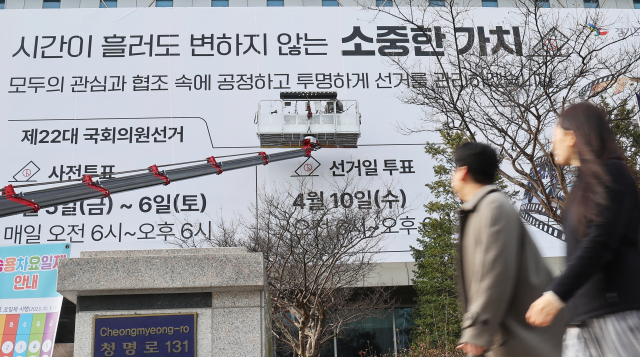여야 정치권이 총선 후보자의 ‘공정한 선출’을 강조하며 ‘여론조사 경선’에 나섰다. 사진은 총선을 43일 앞둔 27일 오전 경기도 수원시에 걸린 투표 참여 홍보 현수막 모습. 연합뉴스 제공.