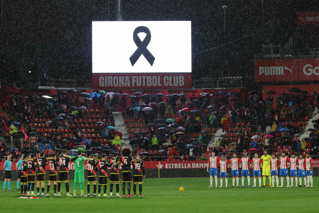26일(현지시간) 스페인 지로나 몬틸리비 경기장에서 열린 2023-2024 스페인 프리메라리가 라요 바예카노와 지로나FC의 경기. 이날 양 팀 선수들은 최근 발렌시아의 다층 주택가에서 대화재로 목숨을 잃은 10명의 희생자들을 기리기 위해 경기 전 1분간 묵념의 시간을 가졌다. 이날 경기에선 지로나가 우크라이나 국적 빅토르 치한코우의 선제골과 브라질 ‘신성’ 사비우의 추가시간 2골로 라요 바예카노를 3-0으로 물리쳤다. AFP연합뉴스