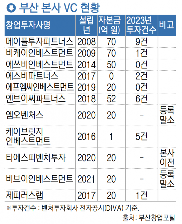 부산에 본사를 두고 있는 VC업계는 형편이 더 좋지 않다. 부산시에 따르면 부산이 본사인 창업투자사는 모두 11곳이다. 2008년 설립된 메이플파트너스, 비케이인베스트먼트 등이다. 그러나 실제로 운영되고 있는 투자사는 8곳이다. 엠오벤처스·비브이인베스트먼트는 등록을 말소했고, 티에스피벤처투자는 사명을 바꾸고 인천으로 옮겨갔다. 벤처투자회사 전자공시(DIVA)에 따르면, 부산 VC의 지난해 실제 투자 건수는 24건으로 미미한 수준이다. 투자사 중 투자 건수가 1건인 곳은 2곳, 한 번도 투자를 진행하지 않은 곳도 2곳이나 된다.