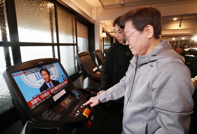 민주당 이재명 대표가 28일 서울 한 헬스장에서 정책간담회 전 러닝머신을 살펴보고 있다. 공교롭게 화면에 임종석 전 대통령 비서실장의 뉴스가 나오고 있다. 연합뉴스