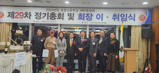 재부포항고등학교동문회는 지난 28일 부산 해운대구 그린나래호텔에서 정기총회를 열고 심찬규 이임 회장과 김치용(동의대학교 대외협력원장)신임 회장 이·취임식을 가졌다.