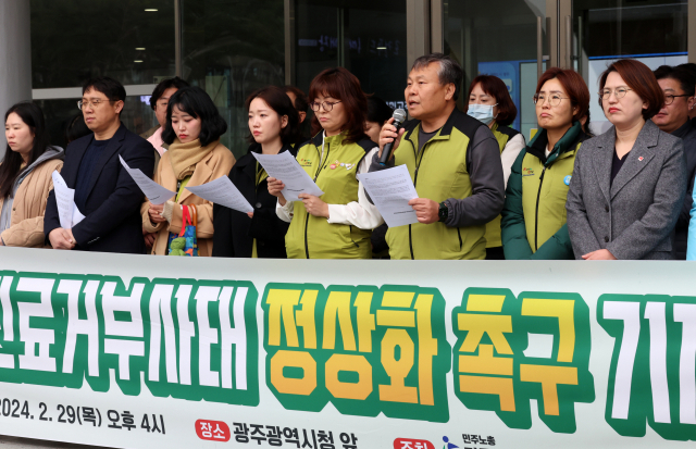 전국보건의료산업노동조합 광주·전남지역본부 관계자들이 29일 오후 광주광역시청 앞에서 의사 진료 거부 사태 정상화를 촉구하는 기자회견을 하고 있다. 연합뉴스