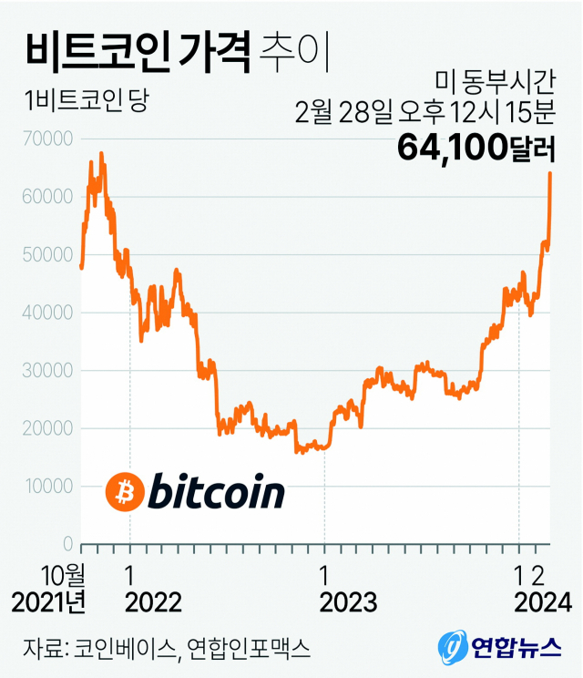 같은 시간 달러로는 가상자산 시황 중계사이트 코인마켓캡에서 비트코인이 전일 대비 10.9% 치솟은 6만 3375달러에 거래되고 있다. 비트코인 가격이 6만 달러를 넘어선 것은 2021년 11월 이후 처음이다.
