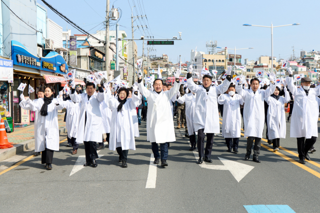 통영시는 제105주년 3·1절을 맞아 지난 1일 시민 500여 명이 참석한 가운데 강구안 문화마당에서 통영만세운동 기념행사를 개최했다. 참가자들이 만세를 외치며 행진하고 있다. 통영시 제공
