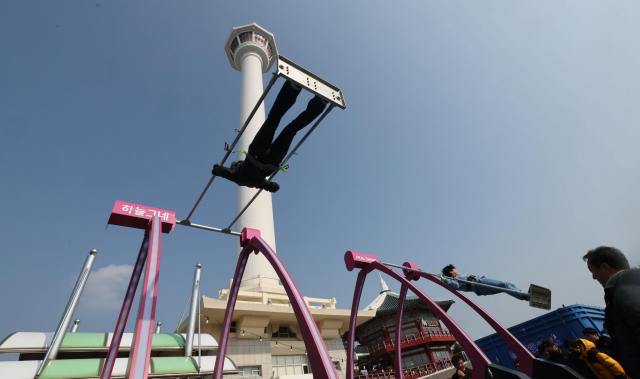 부산 중구 용두산공원 부산타워 앞 광장에서 3일 열린 ‘2024 뽐맞이 용두산공원 하늘그네 챔피언대회’ 참가자들이 힘차게 그네를 타고 있다. 이번 대회는 가장 빨리 360도를 회전하는 사람에게 경품을 지급하는 행사로 부산관광공사가 주최했다.
