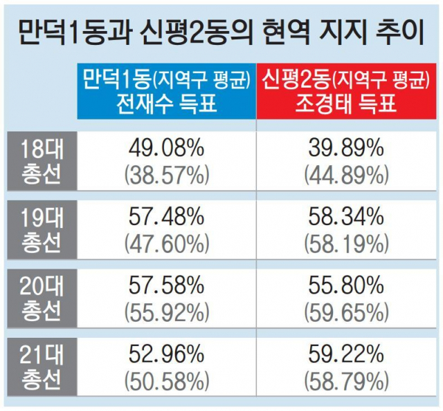 반면, 신평2동을 넘겨 받은 사하갑은 여야 후보가 일찌감치 결정된 터라 새 표밭 분석이 한창이다. 더불어민주당 현역 최인호 의원과 국민의힘 이성권 전 부산시 경제부시장 간의 부산대 총학회장 출신 맞대결이 예정됐다.