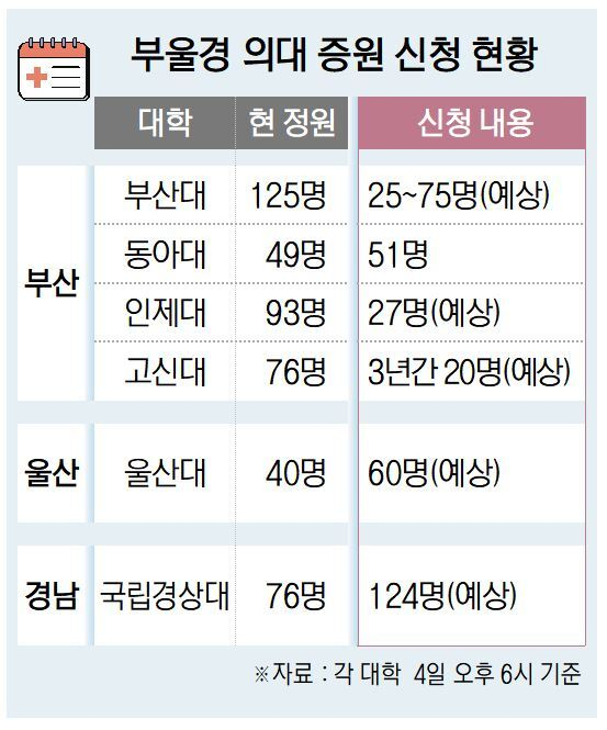 부산대(현 정원 125명)와 인제대(93명), 고신대(76명)도 대학본부와 의과대학 간의 막바지 협의를 거치며 증원 수요 계획을 교육부에 제출한 것으로 보인다. 부산대와 인제대, 고신대는 4일 오후 늦게까지 증원 수요를 두고 고심한 것으로 전해졌다.