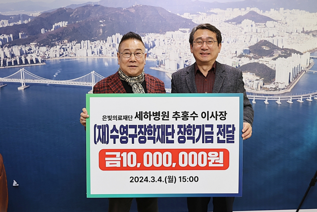 은빛의료재단 세하병원(이사장 추홍수)은 지난 4일 부산 수영구(구청장 강성태)에 우수 인재 발굴과 육성을 위한 장학기금 1000만 원을 기탁했다.