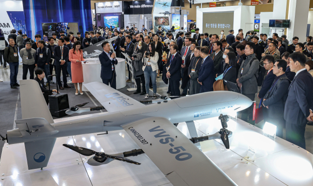‘2024 드론쇼 코리아’가 6일 부산 해운대구 벡스코 제1전시장에서 개막했다. 관람객들이 수직이착륙 무인기인 VVS-50 초도기를 살펴보고 있다. 10개국 228개 업체가 참가한 이번 드론쇼는 8일까지 열린다.